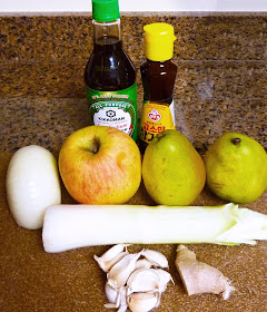 1. Add white part of leek, onion, apple, pears, garlics, minced ginger to a blender. Blend until there is no chunk.